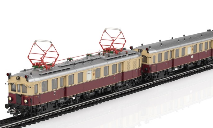 Mitte der 1960er Jahre brachte Märklin das erste Modell einer E10 auf den Markt. Damals erschien die neue Elektrolok aber nicht in der Version mit der markanten "Bügelfalte". Dieses Gehäuse fristete lange Zeit als Prototyp sein Dasein im Märklinfundus und bleib ein unerfüllter Wunsch aller damaligen Modellbahnfreunde. Nun erscheint das Modell auf Basis dieses alten Prototyps als exklusives Retro-Sammlerstück mit den passenden Schnellzugwagen im edlen kobaltblau/beigen "Rheingold-Design".