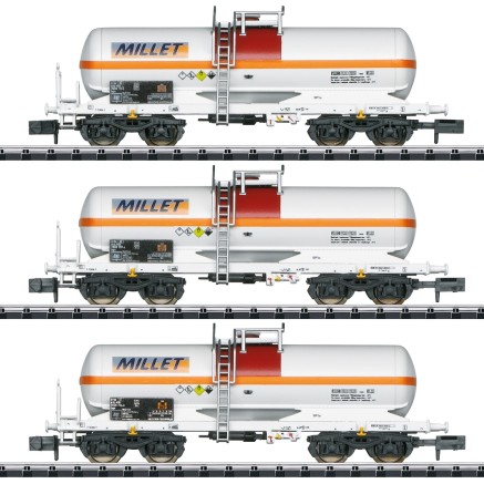 Dieses Set aus drei Chemie-Kesselwagen für gasförmige Stoffe ist von französischen Betreiber MILLET in den Niederlanden eingestellt. Ein schönes Beispiel für Freizügigkeit im europäischen Güterverkehr der Epoche VI.