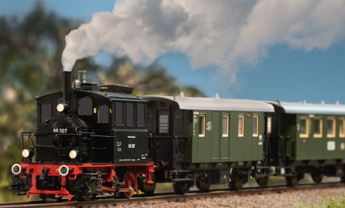 Die kleine Lok der Baureihe 98.3 - vormals bay. PtL 2/2 - hat als Modell grundlegende Verbesserungen erfahren. Der neue Pufferspeicher hilf der kurzen Maschine besser über stromlose Stellen hinweg und das Gehäuse aus metallgefülltem Kunststoff erhöht das Gewicht der Lok und damit auch die Zugkraft. Nachgebildet wird in diesem Zugset, ein Nebenbahnzug der 1950er und 60er Jahre wie im Spalter Hopfenland unterwegs gewesen ist. Die stromführenden Kupplungen versorgen die Innenbeleuchtung der Reisezugwagen und deren jeweils eigenen Pufferspeicher. Eine flackernde Innenbeleuchtung gehört damit der Vergangenheit an.