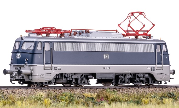Modell der E 10 384 im Zustand um 1967 mit Pufferverkleidung und Schürze. Lokrahmen in steingrau als Versuch zur besseren Erkennbarkeit der Lokomotiven.